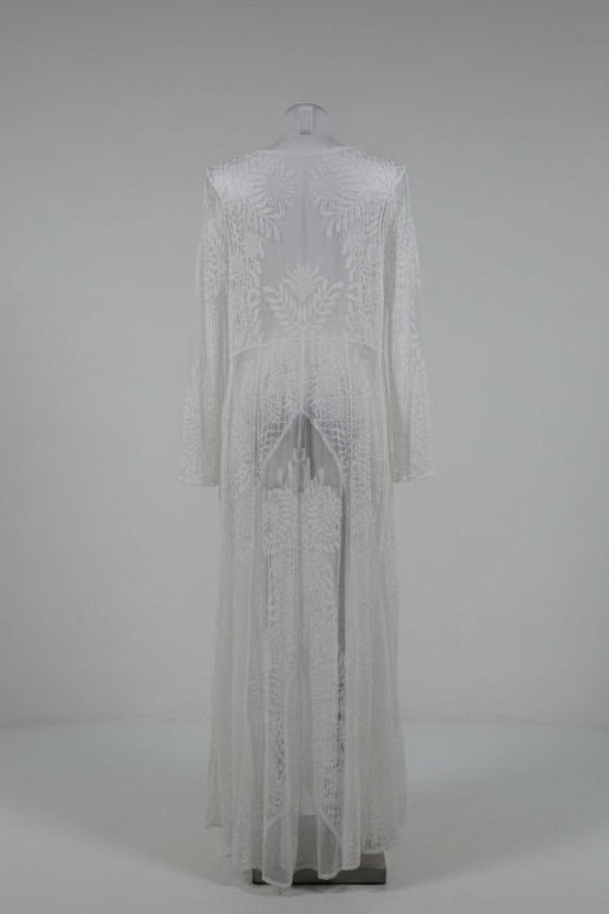 Kimono largo de algodón con delicado trabajo de encaje floral, ligero y elegante. Su diseño abierto y fluido cae suavemente sobre el cuerpo, aportando movimiento y un aire femenino y sofisticado.