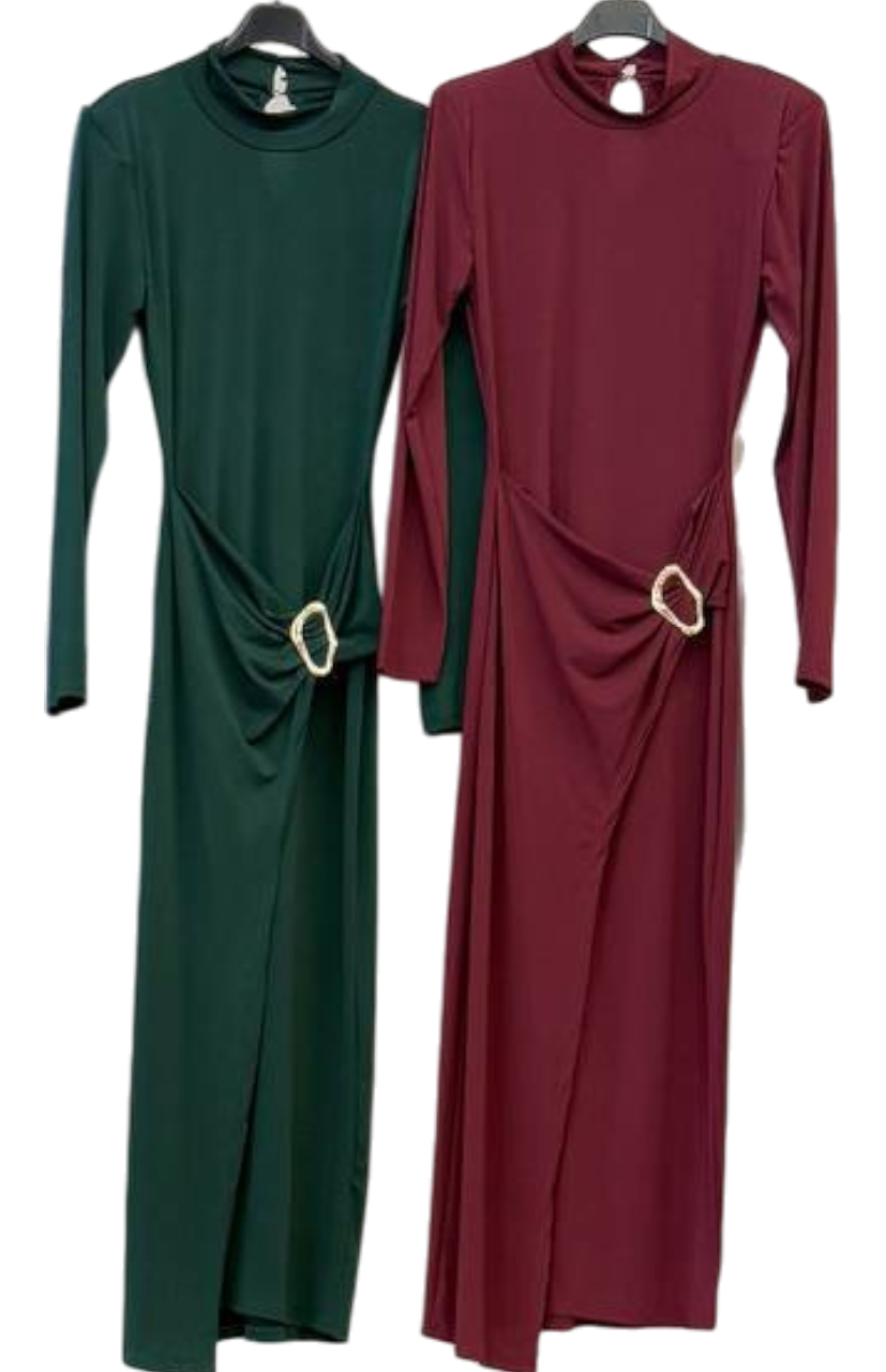 Dotée d'un col montant, de manches longues et d'une fente sur le devant qui apporte mouvement et sensualité, cette robe est rehaussée d'une boucle dorée à la taille qui crée un joli froncement mettant en valeur la silhouette.