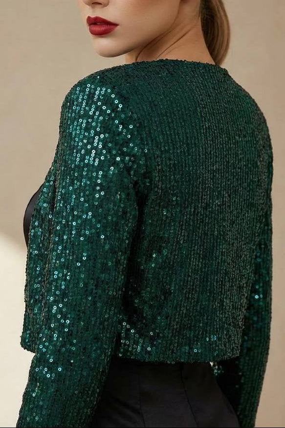 Una chaqueta corta con presencia. Éclat Nocturne está pensada para esas noches donde el look pide carácter, brillo y actitud. Las lentejuelas aportan profundidad y reflejan la luz de forma elegante, sin exceso, creando un efecto sofisticado y muy favorecedor.