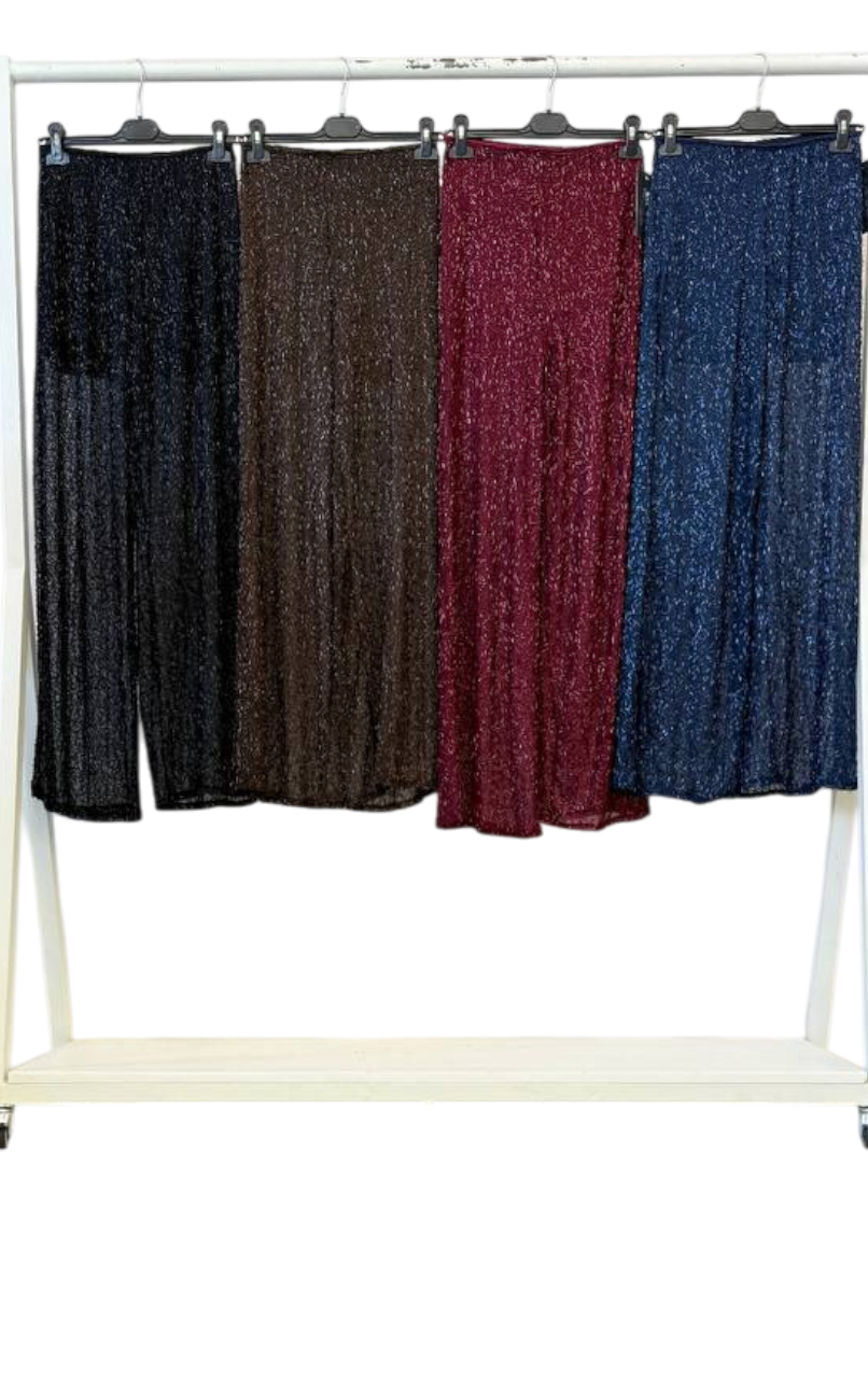 Un toque de luz para tus noches y eventos especiales. Estos pantalones de tejido semitransparente con bordado brillante combinan elegancia y movimiento, reflejando la luz con cada paso. Su diseño fluido estiliza la figura y aporta un aire sofisticado sin renunciar a la comodidad.