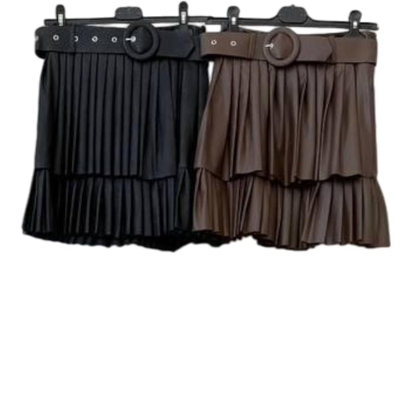 Una prenda con carácter que combina fuerza y feminidad. Esta falda corta de polipiel destaca por su diseño con pliegues en capas que aportan movimiento y volumen, y un cinturón ancho con hebilla redonda que marca la cintura de forma favorecedora.