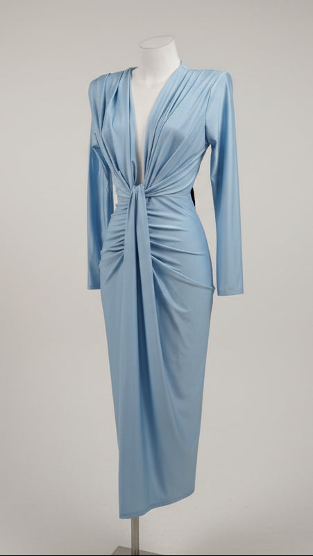 Vestido largo de manga larga con diseño drapeado que realza la silueta de forma elegante y femenina. Presenta un escote pronunciado en pico con fruncido central que estiliza el torso y aporta un efecto sofisticado. El tejido es fluido y suave al tacto, adaptándose al cuerpo sin marcar en exceso. La cintura se ajusta de manera natural, creando una línea favorecedora, mientras que la falda cae recta con movimiento. Un vestido ideal para eventos, ocasiones especiales o looks de noche con un aire moderno y refinado. Talla única que se adapta de S a L.