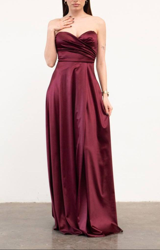 Vestido largo de corte elegante y femenino, confeccionado en tejido satinado con caída fluida que estiliza la silueta. El escote drapeado realza el pecho de forma natural, mientras que el diseño entallado en la cintura define la figura sin marcar en exceso. La abertura frontal aporta movimiento y un toque sofisticado, perfecto para eventos especiales, bodas, cenas o noches importantes.