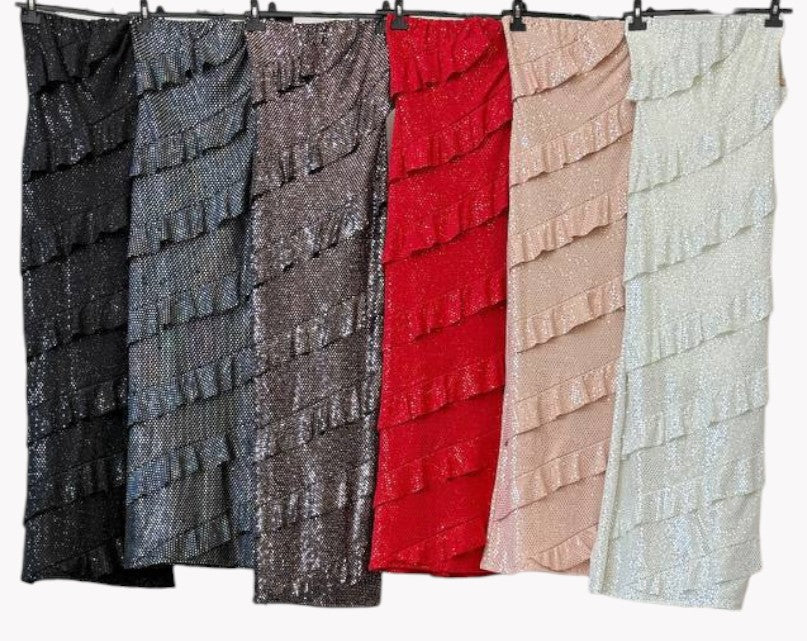 Vestido midi con tejido brillante de efecto malla, volantes diagonales y corte palabra de honor que realza la figura con elegancia.