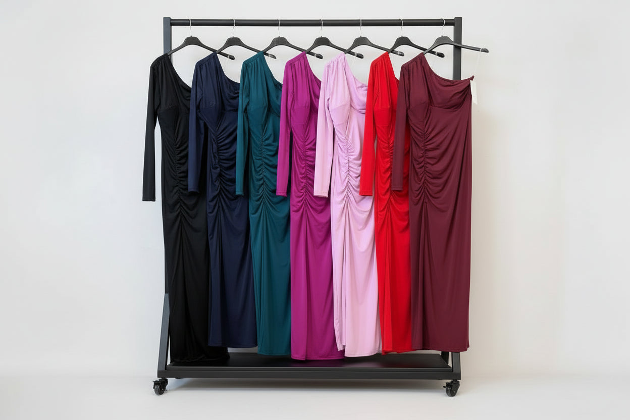 Vestido largo de diseño asimétrico que estiliza la silueta y realza la figura con un ajuste perfecto y favorecedor