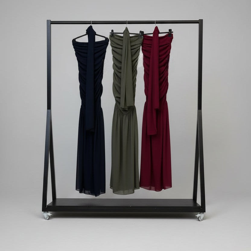 Vestido largo de estilo elegante y favorecedor, diseñado para realzar la silueta con un toque sofisticado. Su escote palabra de honor con efecto choker integrado aporta un aire moderno y distinguido, perfecto para eventos especiales.