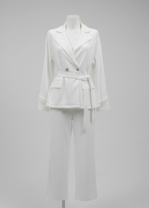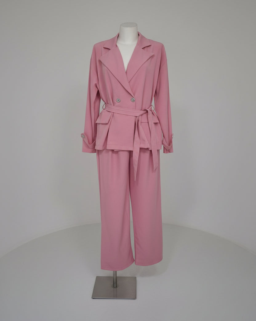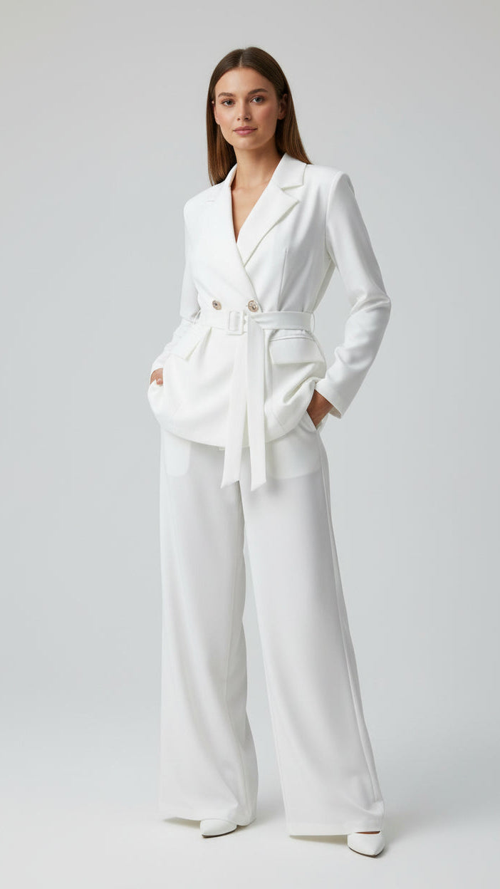 Conjunto elegante de dos piezas compuesto por blazer cruzada y pantalón de corte recto y fluido, diseñado para estilizar la silueta y aportar un look sofisticado y actual. La blazer presenta solapas clásicas, cierre cruzado y cinturón del mismo tejido que permite ajustarla a la cintura, realzando la figura con un acabado muy femenino. El pantalón de tiro alto y caída suave aporta comodidad y equilibrio al conjunto. Ideal para eventos, ocasiones especiales, reuniones, celebraciones, cenas o para elevar un look más formal con un estilo impecable y versátil.
